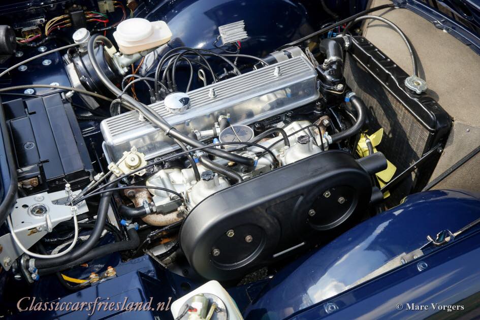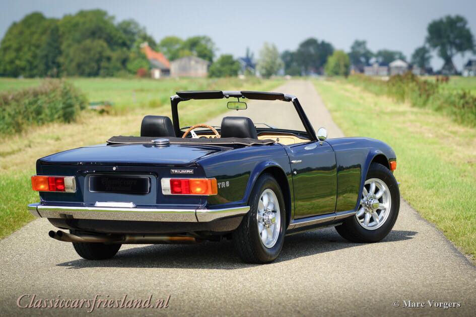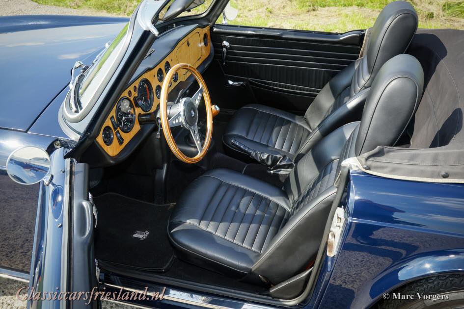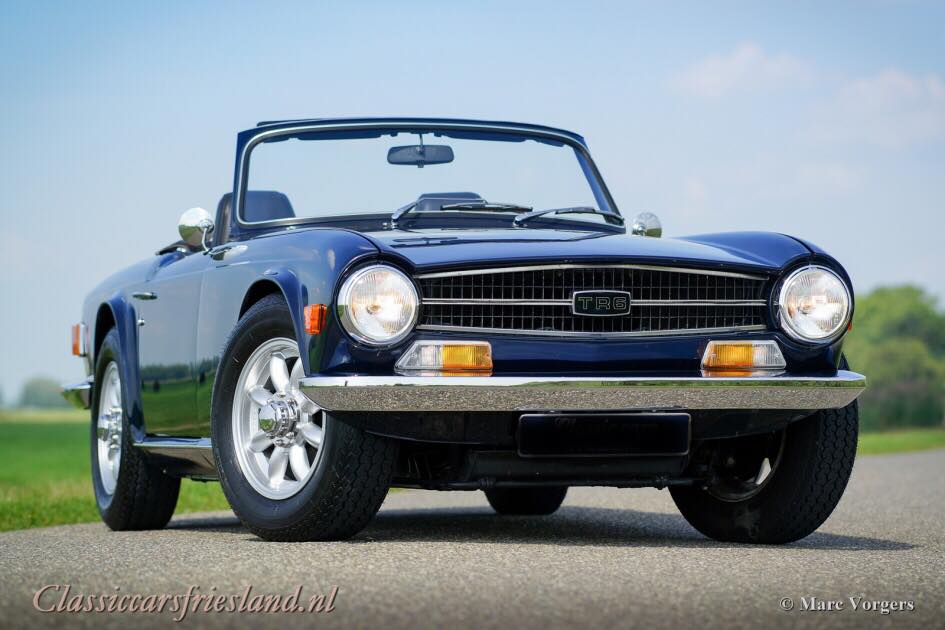 Het betreft een Triumph TR6 van 1969 met Belgisch kenteken O-ADX-946 , chassisnummer CC28816L , in donkerblauwe kleur, zwart lederen interieur, houten monolita stuur... de wagen heeft aan de softtop een kleine beschadiging aan de passagierszijde achteraan.