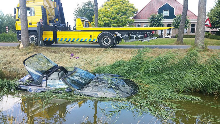 Op foto's is te zien dat de wagen flinke schade heeft en vol met water staat. Hoe het met de eigenaar gaat, die zijn droom letterlijk in het water zag vallen, is niet bekend.