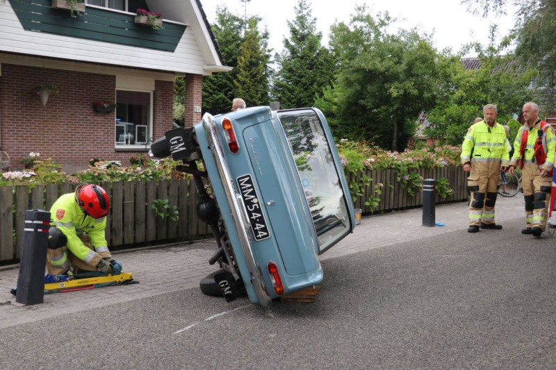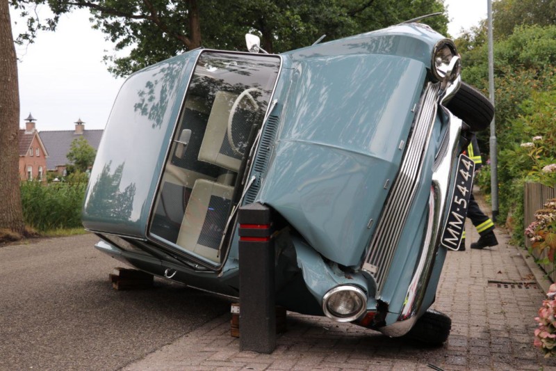 Ter plaatse trof de brandweer een oldtimer uit 1963 op zijn zij aan. De brandweer heeft de bestuurder uit zijn benarde positie bevrijd.
