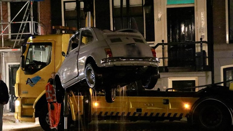 Roeland Bloemen heeft zijn auto terug. Zondagochtend was zijn klassieke Fiat 500 uit 1974 opeens verdwenen van zijn parkeerplaats aan de Leidsegracht, gisteren werd de auto in diezelfde gracht teruggevonden.