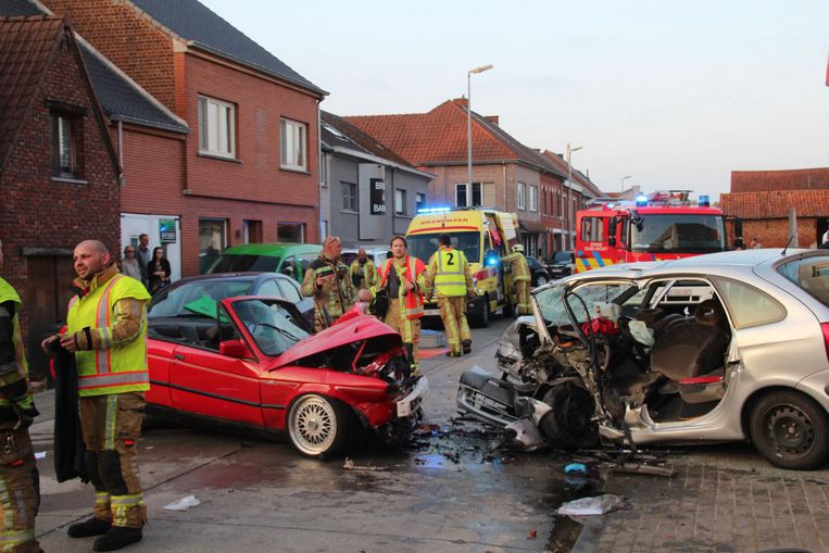 Ondanks een stevig remmanoeuvre knalden beide wagens ter hoogte van Residentie De Kloef - in de vroegere klompenfabriek - frontaal op elkaar. Bij de terugslag werden nog drie geparkeerde wagens geraakt. Een op de stoep geparkeerde wagen ging net niet door het raam van de refter van residentie De Kloef. Die wagen is eveneens total loss. “Ik kwam net thuis toen ik een enorme klap hoorde. Toen ik me omdraaide, zag ik de ravage”, vertelt verpleegkundige en buur Carmen De Vleeschouwer. De vrouw aarzelde geen moment en bood meteen hulp. “Het was afschuwelijk. De bestuurder van de BMW geraakte zwaargewond aan zijn benen en gaf geen teken van leven meer. Ik vreesde dat hij het niet zou halen”, vertelt ze.